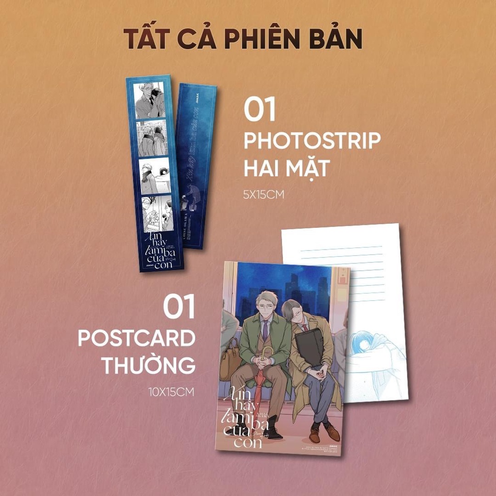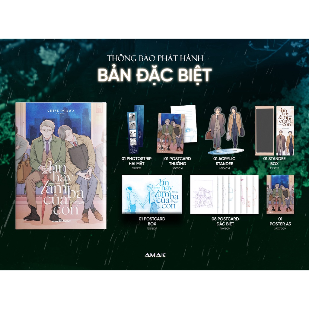 THÔNG BÁO PHÁT HÀNH – Xin hãy làm ba của con Tác giả: Chise Ogawa Dịch giả: Ao Thể loại: Truyện tranh Khổ sách: 13x18cm Số trang: 184 trang ISBN: 978-604-355-529-5 NXB liên kết: NXB Hà Nội Nhà phát hành: AMAK BOOKS Quà tặng kèm: - Bản thường: - 1 photostrip cán bóng, 1 Postcard Ivory bồi đôi, Giá bìa 99.000đ - Bản thường có poster: 108.000đ - Bản đặc biệt: - 1 photostrip cán bóng, 1 Postcard Ivory bồi đôi, 1 postcard box gồm set 8 postcard, 1 standee acrylic (6.5x14cm) kèm hộp đựng riêng, 1 poster A3. Giá bìa: 269.000đ