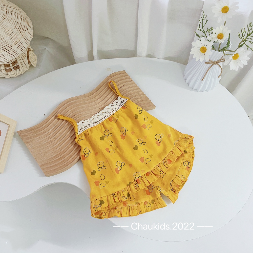 Giới thiệu [SALE] Bộ 2 Dây Bé Gái Hoạ Tiết Quả Dâu Vải Đũi Tằm Mềm Mát Phối Ren Cổ, Đồ Bộ Cho Bé Mặc Nhà CK28