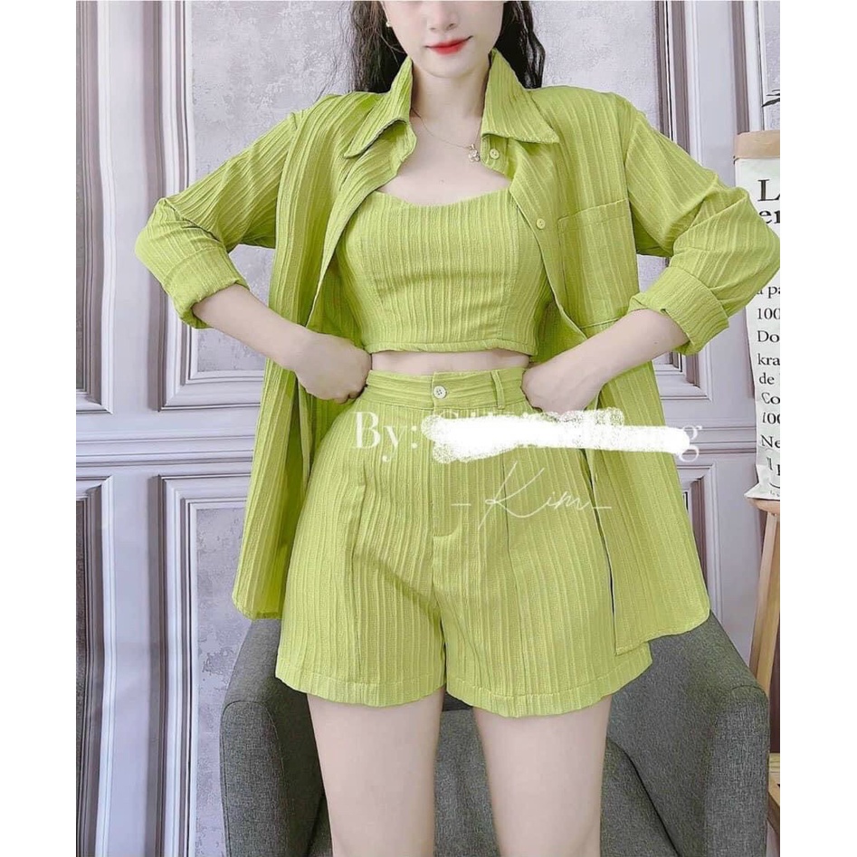 Giới thiệu (Sale FreeShip) Sét đũi 3 món,sét nữ áo sơ mi tay dài from rộng kèm áo 2 dây mix quần có túi,tone màu tôn da