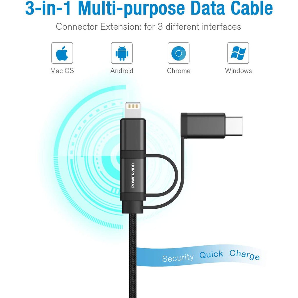 ***1M long 3 in 1 USB Connecter to lightning/micro/type-c cable is made of extra strong Nylon Braided and high quality copper wires cable with metal shell connector.