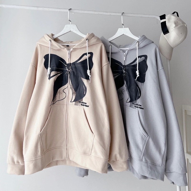 Giới thiệu (sẵn) Áo khoác dây kéo nỉ lót bông form rộng in nổi Hình Nơ unisex (nam nữ mặc được)