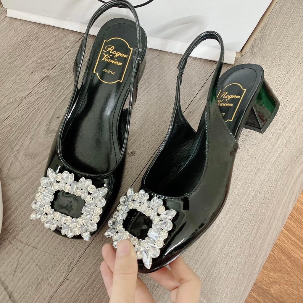 Giới thiệu Sandal bít mũi da bóng vuông nơ đá trắng gót trụ thấp - 3P