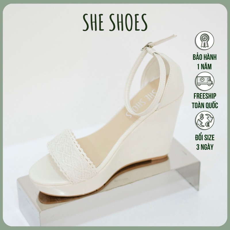 1. GIÀY SANDAL ĐẾ XUỒNG 11 CM: Một đôi giày sandal đế xuồng, một đôi giày cưới đế xuồng xinh, siêu nhẹ, siêu êm sẽ mang đến bạn cảm giác thoải mái, tự tin hơn trong ngày trọng đại của mình. Dù bạn là một cô gái cá tính hay điệu đà, giày cưới cao gót vẫn luôn có cách để tôn vinh tính cách ẩn sâu bên trong bạn. 2. CHẤT LIỆU DA CAO CẤP : hoạ tiết PHỐI REN TRƠN nhẹ nhàng, đơn giản với màu sắc trắng tinh khôi, cao cấp rất phù hợp với những chiếc đầm cưới tạo nên một couple hoàn hào. Chắc chắn nàng sẽ trông rất xinh và sang khi ướm lên đôi giày sandal đế xuồng, sandal nữ tính này. 3. FORM DÁNG CHUẨN ÊM CHÂN: Giày cao gót, giày cưới nữ được thiết kế độc quyền bởi SHE SHOES, rất tỉ mĩ với form dáng chuẩn đối với người Việt, giúp bảo vệ nâng niu bàn bạn chân của nàng, đảm bảo giày mềm êm chân, giữ form tốt. 4. ĐẾ GIÀY TPR CAO CẤP ĐÀN HỒI CAO, HẠN CHẾ TIẾNG ỒN: Đế giày cao gót nữ độc quyền SHE SHOES được làm bằng chất liệu TPR cao cấp theo tiêu chuẩn xuất khẩu, đảm bảo độ đàn hồi, mềm êm, hạn chế tiếng ồn phát ra khi di chuyển. Đặc biệt đế giày SHE SHOES có độ BÁM DÍNH tốt, không trơn trượt.