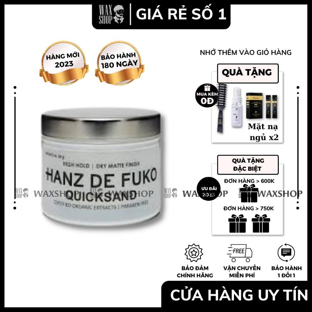⚡ Hàng Hanz De Fuko - Quicksand của Waxshop luôn có tem của chính hãng. ⚡ Có luôn cả tem 3D của Shop để phân biệt hàng trôi nổi trên thị trường. ⚡ Bên mình luôn bảo hành 1 Đổi 1 với lỗi từ Nhà Sản Xuất. Do đó bạn cứ An Tâm sử dụng. ⚡ Đây là lô hàng mới nhất năm 2023 bên mình. Ngoài ra Shop còn có Tặng Kèm Thêm Quà cho các bạn nữa nha. ⚡ Đối với các bạn mới sử dụng thì bên mình còn có gửi bộ Video hướng dẩn tạo kiểu và Tips tạo kiểu. Do đó các bạn không sợ việc không biết cách dùng. ----------- 1️⃣ Giới Thiệu và Công Dụng: - Dòng sản phẩm làm mưa làm gió trên thị trường US với nhiều lựa chọn. - Đây là sản phẩm được David Beckham tin tưởng lựa chọn. - Hanz De Fuko Quicksand là sản phẩm tạo kiểu tóc và giữ nếp rất tốt, nhưng quan trọng hơn nữa là sản phẩm này như tên gọi của nó Quicksand, tạo cảm giác khi sử dụng là các hạt cát nhỏ li ti, nên làm tăng thể tích tóc lên rất nhiều, đặc biệt thích hợp cho các bạn có mái tóc thưa và mỏng. Hảy thử và cảm nhận. - Phiên bản 2023 với chất sáp màu xám, và đây cũng là phiên bản mới nhất của Hanz de Fuko - Dung tích 56gram ----------- 2️⃣ Đặc điểm và công dụng: - Độ giữ nếp nằm giữa ở trung bình và cao. Hay còn gọi là Flexible Hold hoặc High Hold. - Không chứa mùi hương (mùi bạn ngửi được đó là mùi nguyên liệu thô) - Cực kì nhẹ tóc, thích hợp với những bạn tóc mỏng, trung bình - Hút dầu rất tốt, sản phẩm giúp tóc bạn giảm lượng dầu tiết ra, trông tóc sạch sẽ và tự nhiên. - Sử dụng sản phẩm không làm bóng tóc, khiến tóc bạn trông như không xài sáp. - Độ phồng cao, Texture cũng dễ tạo kiểu cực kì tốt ----------- + Hoàn thiện cực mờ, không làm bóng tóc. + Tăng thể tích tóc, làm phồng. + Giữ nếp cực tốt, có thể vuốt lại thoải mái sau khi đội nón bảo hiểm. + Không rít tóc, dể gội đầu. + Sản phẩm có chất dưỡng ẩm và bảo vệ tóc. + Không gây hại tóc. ---------- ✨Công dụng và điểm nổi bật Premium Pre Styling Oil: