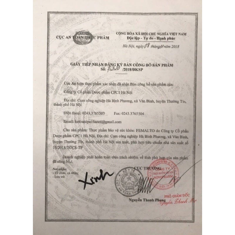 Cảnh báo sức khoẻ khi dùng Femalto Sản phẩm Femalto không phải là thuốc, không có tác dụng thay thế thuốc chữa bệnh Không dùng cho người mẫn cảm với bất kỳ thành phần nào của sản phẩm. Trong quá trình sử dụng, nếu có bất kỳ biểu hiện bất thường nào thì hãy ngưng sử dụng và liên hệ với bác sĩ, dược sĩ để được tư vấn. Đọc kỹ hướng dẫn sử dụng trước khi dùng.
