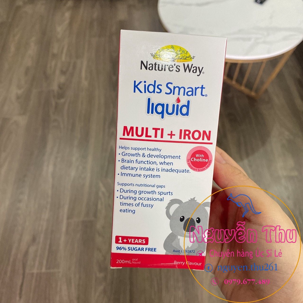 Sắt nước Nature Way và vitamin tổng hợp cho bé từ 1 tuổi Kids Smart Liquid Multi + Iron nature way, 200ml CÔNG DỤNG: ☉ Bổ sung sắt, kẽm và các vi chất cần thiết cho trẻ; ☉ Hỗ trợ tăng cường sức đề kháng, tăng miễn dịch tự nhiên; ☉ Giúp trẻ ăn ngon, ngủ ngon, tăng cần, lớn nhanh và phát triển toàn diện; ☉ Bổ sung choline tăng cường chức năng nhận thực cho trẻ.