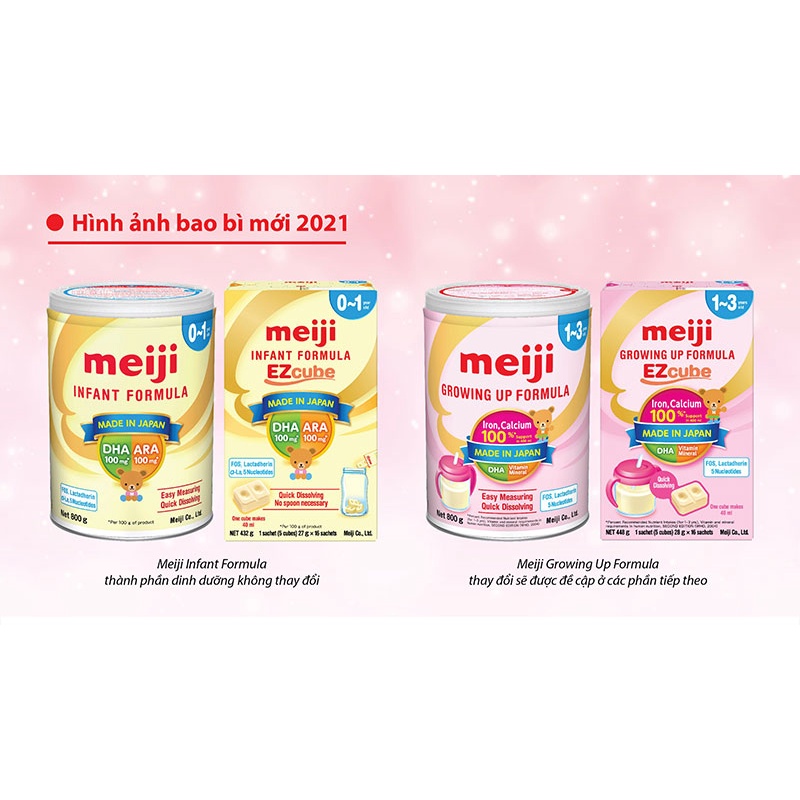 Sữa Meiji dạng thanh số 0-1 cho trẻ từ 0-1 tuổi Sữa Meiji dạng thanh số 1-3 cho trẻ từ 1-3 tuổi Dùng cho các bé chuẩn bị sinh rất tiện. Hàng nhập khẩu chính hãng gồm 16 thanh, mỗi thanh 5 viên. 1 viên pha 40ml nước ở nhiệt độ 70 độ C -------------------------- Sản xuất tại Nhật Bản (Việt Nam chỉ phân phối)==> được người NHẬT BẢN nghiên cứu và sản xuất DÀNH RIÊNG CHO TRẺ VIỆT NAM. Công nghệ dạng viên dễ tan (Độc quyền của MEIJI trong 30 năm) -------------------------- Ưu điểm: DHA 100mg (khuyến cáo WHO từ 70mg trở lên) + Dạng thanh viên tiện dụng (dùng thử, cho bé đi du lịch, mẹ mới sinh chưa có sữa ngay) DHA (100mg/100g) ARA (100g/100g) Taurin: Giúp trẻ phát triển trí não FOS: chống táo bón, tăng cường miễn dịch cho trẻ Ca/P=1,8, Vitmain D: Giúp phát triển hệ xương vững chắc, phát triển chiều cao Vitamin K: Phòng ngừa xuất huyết não Áp xuất thẩm thấu và chất tải thận tương tự như sữa mẹ: tốt cho hệ tiêu hóa, tuần hoàn và thận của trẻ Bổ sung, cải tiến hàm lượng vitamin, chất khoáng, protein, chất béo, carbonhydrat phù hợp, dễ tiêu hóa, hấp thụ. ***Sữa Meiji nhập khẩu đặt hàng và nhập nguyên lon từ Nhật, không phải đóng gói tại Việt Nam Hàm lượng các chất dinh dưỡng như DHA, Ca hoàn toàn giống với sữa nội địa Nhật.