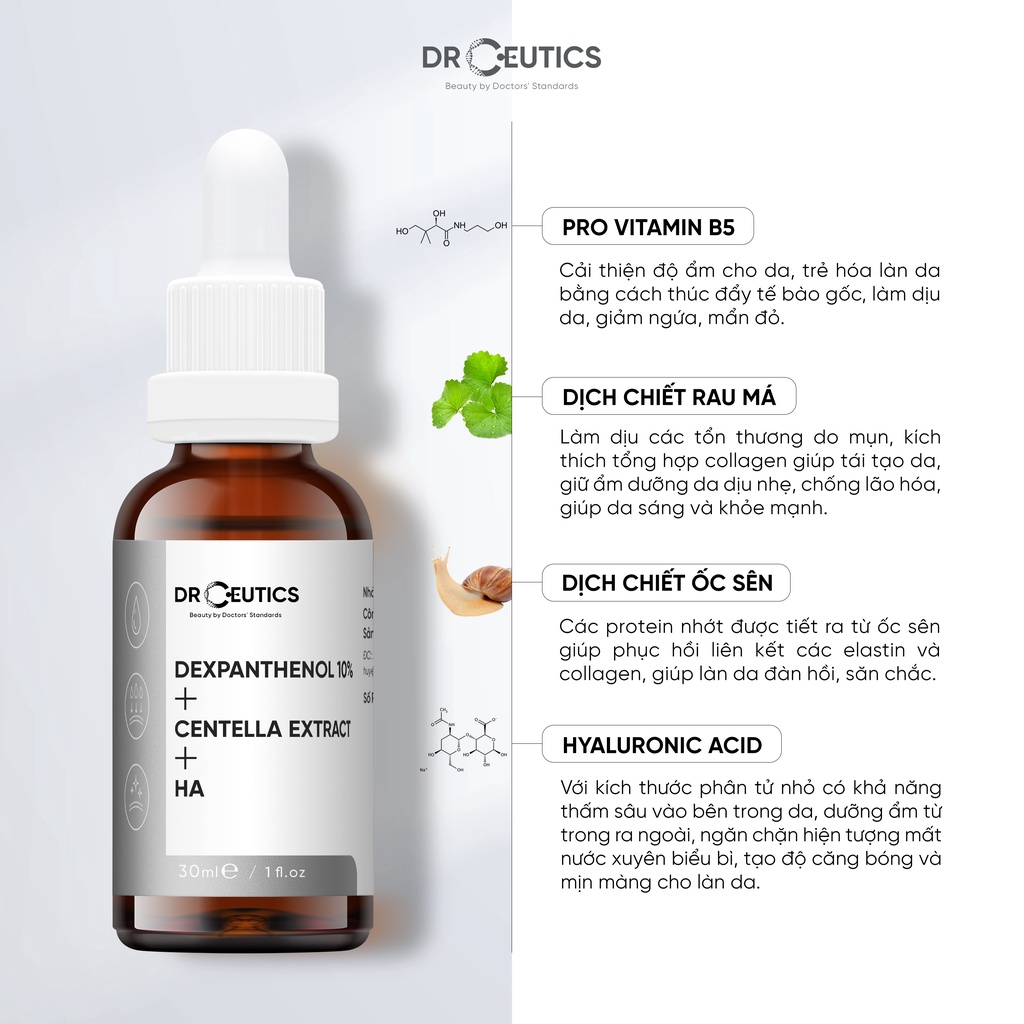 Giới thiệu Serum B5 DrCeutics Cấp Ẩm Và Phục Hồi Da Dexpanthenol 10% + Centella Extract + HA 30ml