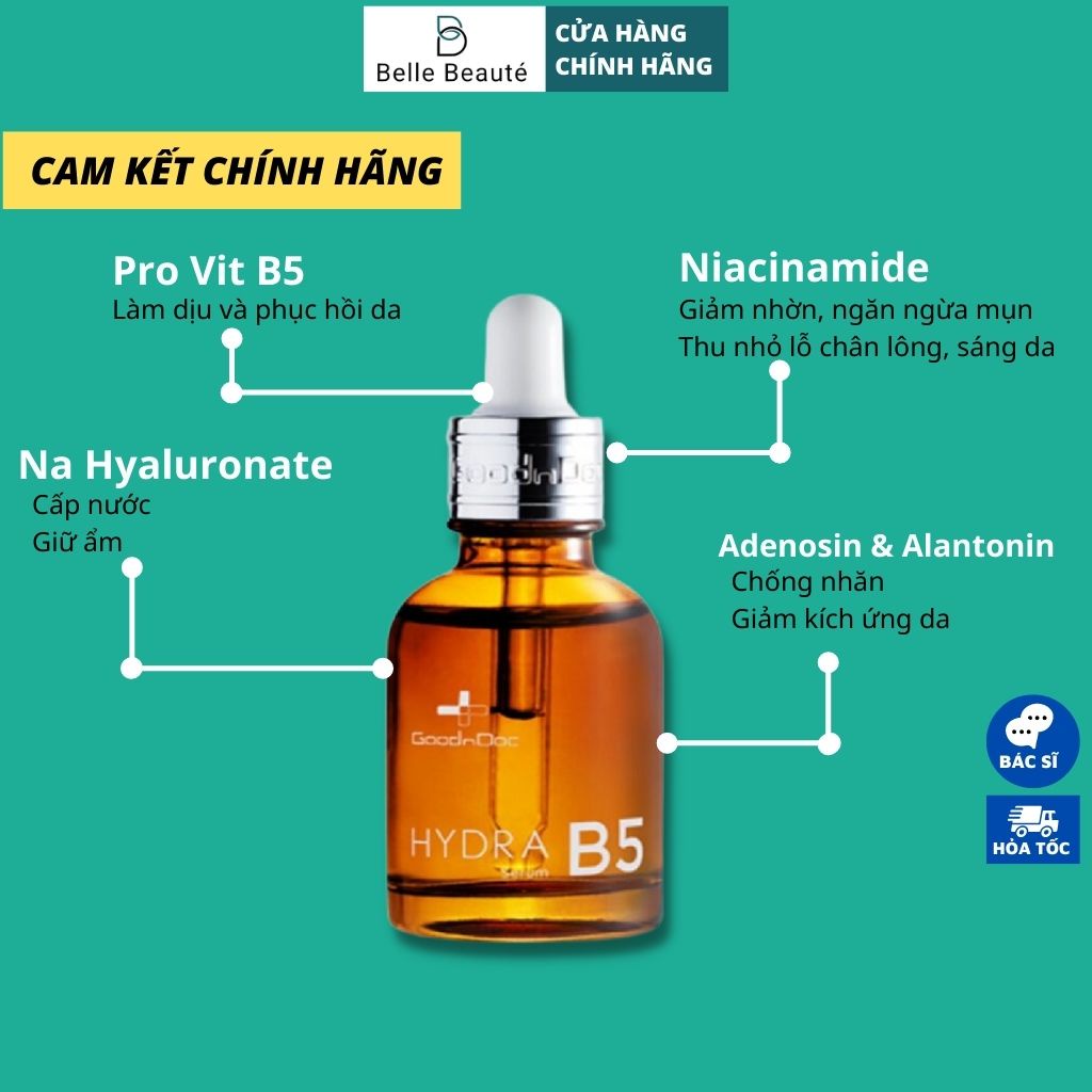 ĐẶC ĐIỂM SẢN PHẨM 1. Goodndoc Hydra B5 Serum 30ml - Pro Vitamin B5: Hiệu quả dưỡng ẩm với khả năng thẩm thấu cực tốt, kháng v.ie.m, giảm mẩn đỏ, thúc đẩy sự hồi phục cấu trúc da. - Niacinamid: Hoạt chất giúp sáng da. - Adenosin: Hoạt chất chống nhăn hiệu quả. - Na hyaluronic: Hoạt chất dưỡng ẩm cao.