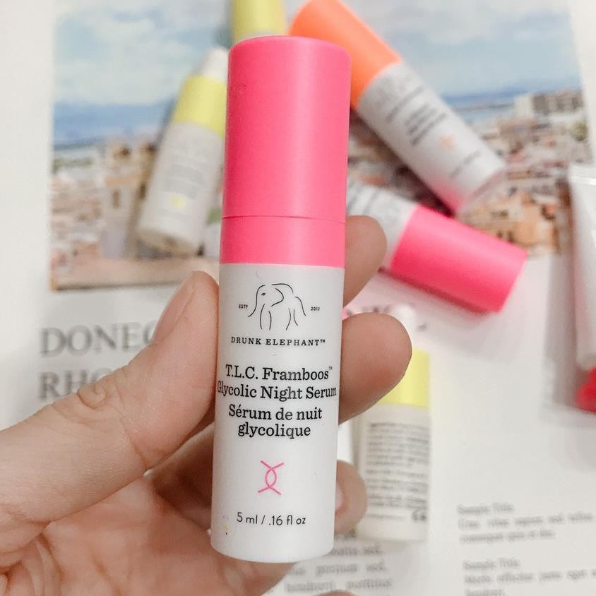 🌸 Drunk Elephant T.L.C Framboos Glycolic Night Serum - Tinh chất dưỡng tái tạo và phục hồi làn da - Minisize - Tinh chất dưỡng da ban đêm giúp phục hồi kết cấu làn da căng mịn và tràn đầy sức sống. - Có chứa đến 12% hỗn hợp AHA như Glycolic Acid, Lactic Acid, tartaric acid, citric acid và 1% Salycilic Acid, serum này giúp da của bạn được thanh tẩy rất cẩn - thận từ bề mặt cho đến sâu lỗ chân lông, kết quả là các vết thâm mờ đi, bề mặt da láng mịn, không còn sần sùi, vảy khô và lỗ chân lông, đặc biệt được cải thiện rất nhanh. - Ngoài tác dụng tẩy tế bào chết, em ấy còn dồi dào các thành phần chống lão hoá, tiết kiệm được cho bạn 1 khoản chi phí nếu phải chi tiền cho 2 sản phẩm để vừa tẩy tế bào chết và vừa chống lão hoá như vậy. Các thành phần như Horse Chestnut, Bearberry và White Tea giúp làm dịu da, sáng da và bảo vệ da khỏi sự lão hoá do các tác nhân kích ứng từ môi trường xung quanh. - Gia tăng collagen, tái tạo kết cấu làn da sâu từ bên trong biểu bì. - Tiếp thêm năng lượng, sức sống cho vùng da xỉn màu. - Tăng cường lớp màn bao bọc, bảo vệ da chống lại các tác hại từ yếu tố môi trường. 👉 Made in USA 👉 Minisize5ml