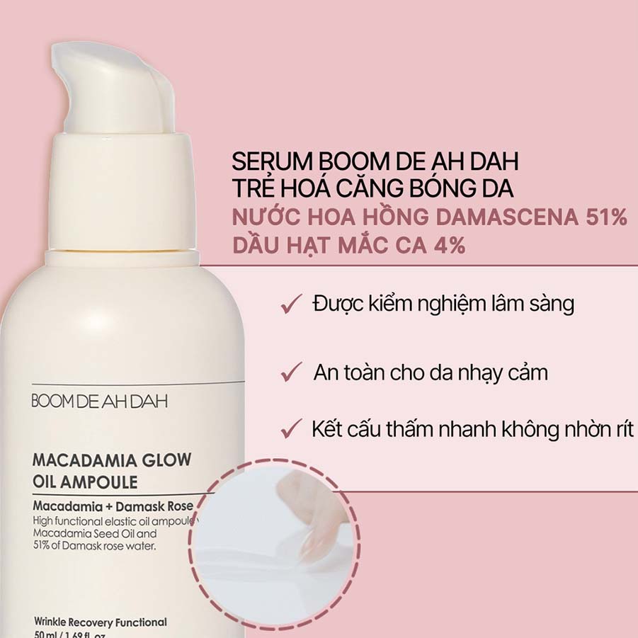 3.SERUM TRẺ HOÁ CĂNG BÓNG DA BOOM DE AH DAH MACADAMIA GLOW OIL AMPOULE 50ml - Nước hoa hồng Damascena 51% + Dầu hạt Mắc Ca 4% - Là dòng sản phẩm tăng cường khả năng chống oxy hoá mạnh mẽ, nuôi dưỡng, phục hồi cấu trúc da đầy đủ giúp lấp đầy nếp nhăn, cải thiện độ đàn hồi, săn chắc, cùng cân bằng dầu nước, duy trì ẩm cho da căng bóng, sáng mịn. Sản phẩm được kiểm chứng bởi Trung Tâm Thử Nghiệm Lâm Sàng Hàn Quốc phù hợp cho mọi loại da, kể cả da nhạy cảm, nhất là những làn da có dấu hiệu lão hoá sớm (da bắt đầu xuất hiện nếp nhăn, da bị khô, sạm, xỉn màu,...)