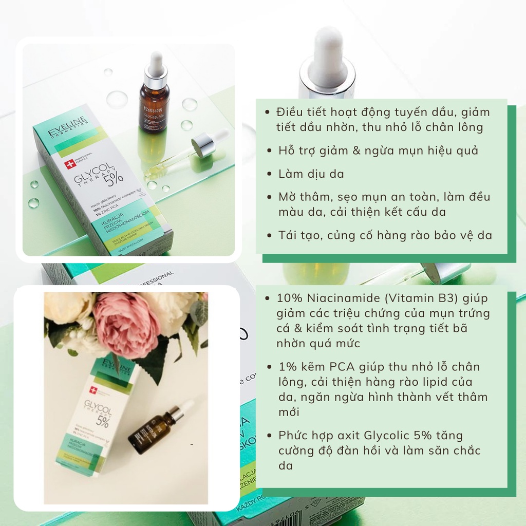 Tinh chất thu nhỏ lỗ chân lông và giảm mụn Glycol Therapy Eveline với các công thức độc quyền: 10% Niacinamide (Vitamin B3), 1% kẽm PCA, 5% Axit Glycolic giúp thu nhỏ lỗ chân lông, cải thiện hàng rào lipid của da.