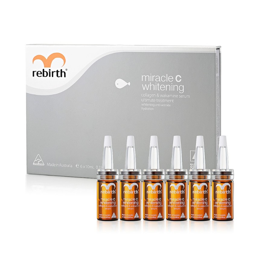 Công dụng - Công thức Serum dưỡng trắng da Rebirth Miracle C Whitening Maximum bao gồm Collagen và dầu Argan Oil giúp làm trắng và sáng da từ sâu bên trong. - Làm mờ dần các sắc tố sạm nám, đốm nâu, tàn nhang, thâm da do mụn. - Giảm đường nhăn và nếp nhăn, ngăn ngừa lão hóa da. - Cung cấp dưỡng ẩm cao cho da khô làm mịn mượt da, không gây nhờn da. - Thúc đẩy da trắng sáng, hồng hào tự nhiên, làm giảm tình trạng dị ứng của da. - Cải thiện kết cấu da, giúp da săn chắc, phục hồi làn da chảy xệ.