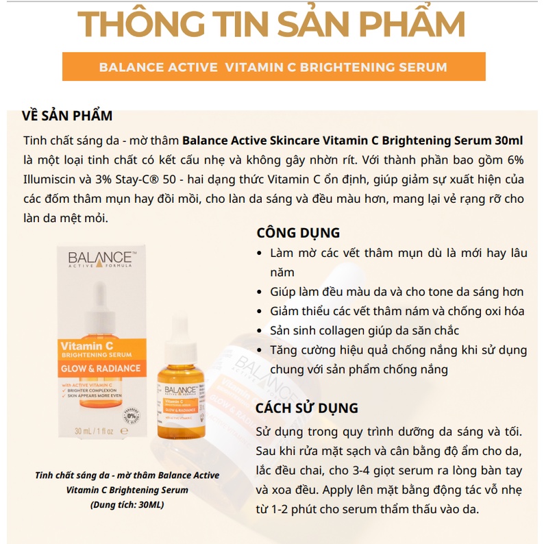Shop Hà Linh xin cam kết 100% sp chính hãng với chứng từ hóa đơn đầy đủ nếu phát hiện hàng giả hàng nhái shop đền 10.000.000 VNĐ (khách hàng có thể yêu cầu xuất hóa đơn đỏ và chịu 10% thuế) shop hiện đang bán giá sale nhằm mục đích xin đánh giá review của khách hàng trong thời gian mở bán ạ, chương trình kéo dài 1 tháng! ---------------------------- Tinh Chất Dưỡng Trắng Da Mờ Thâm Balance Active Formula Vitamin C Brightening Serum là một loại tinh chất thuộc thương hiệu Balance Active Formula có chứa 4% Illumiscin và 2% Stay-C® 50, là hai dạng dẫn xuất từ Vitamin C có tính ổn định, giảm thiểu tối đa sự kích ứng, giúp làm giảm sự xuất hiện của các đốm đồi mồi, cho làn da trắng sáng hơn và đều màu hơn, giảm thâm hiệu quả do mụn để lại.