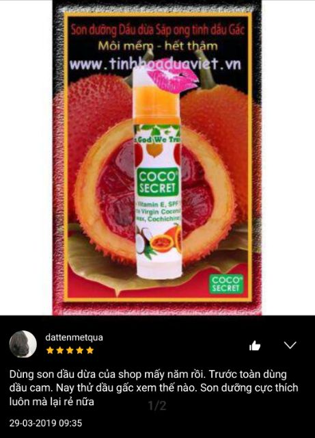 SON DẦU DỪA TINH CHẤT GẤC COCO SECRET (Màu gấc tự nhiên rất nhẹ, gần như không lên màu) *** Khối lượng: 5g *** Thành phần: Sáp ong nguyên chất, dầu dừa nguyên chất tinh khiết Coco Secret, Dầu gấc, tinh chất bạc hà, Essential oil. Không chất bảo quản. *** Tác dụng: dưỡng môi, trị môi khô nứt nẻ, giảm thâm môi, tẩy tế bào chết cho môi, chỉ số chống nắng SPF 5 (khoảng 75 phút) *** Sản phẩm dưỡng môi phù hợp với tất cả mọi người, đặc biệt môi khô nứt nẻ ***Xuất xứ: Công ty CP Dầu Dừa Việt Nam *** Mỗi ngày sử dụng các loại son màu, hoặc do thời tiết khô hanh, hoặc uống quá ít nước sẽ làm cho đôi môi của bạn trở nên kém xinh, màu môi tái nhợt hoặc thậm chí là khô nứt nẻ và chảy máu. Để giúp bạn chăm sóc cho đôi môi, loại bỏ những vấn đề trên và tiết kiệm thời gian, sản phẩm Son dưỡng môi COCO SECRET sẽ là lựa chọn thông minh của các bạn. Với thiết kế nhỏ gọn, các bạn có thể dễ dàng cho vào túi, ví, và sẵn sàng làm đẹp mọi lúc .