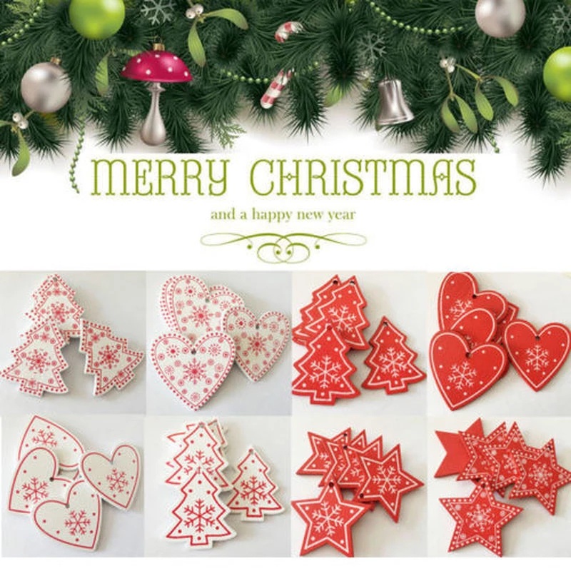2# Mô tả Loại: Đồ trang trí Giáng sinh Màu sắc: Đỏ; Trắng Chất liệu: gỗ Kích thước: Khoảng 5cm Mô hình: Snowflakes Số lượng: 12 CÁI / Lô