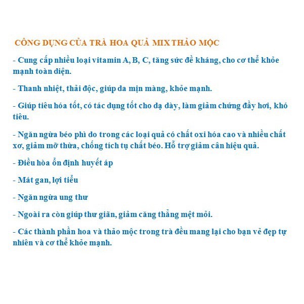 Trà gồm các loại quả được shop sấy trực tiếp rất an toàn do trước khi sấy shop đều rửa sạch sau đó ngâm qua nước muối pha loãng 10ph mới đem sấy khô. Shop làm vì lương tâm và trách nhiệm để đi lâu dài chứ không phải cố gắng để bán được hàng. ✅ Trà có mùi thơm và vị chua ngọt tự nhiên của quả, mùi thơm của hoa khô thảo mộc mix cùng.