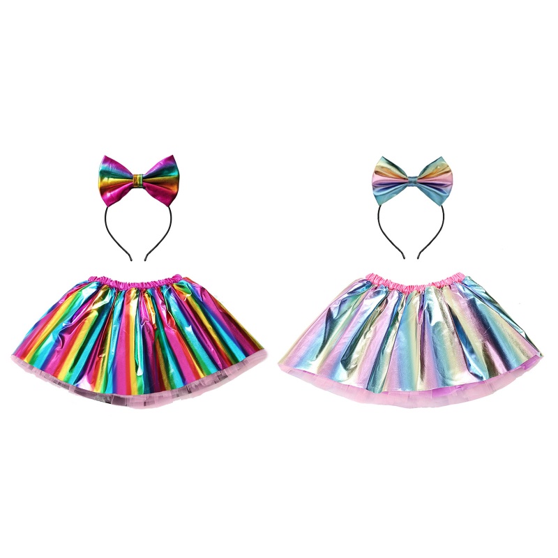 2 chiếc Váy Tutu Cầu Vồng Kim Loại Sáng Bóng Với Băng Đô Lớn Bowknot Mô tả '