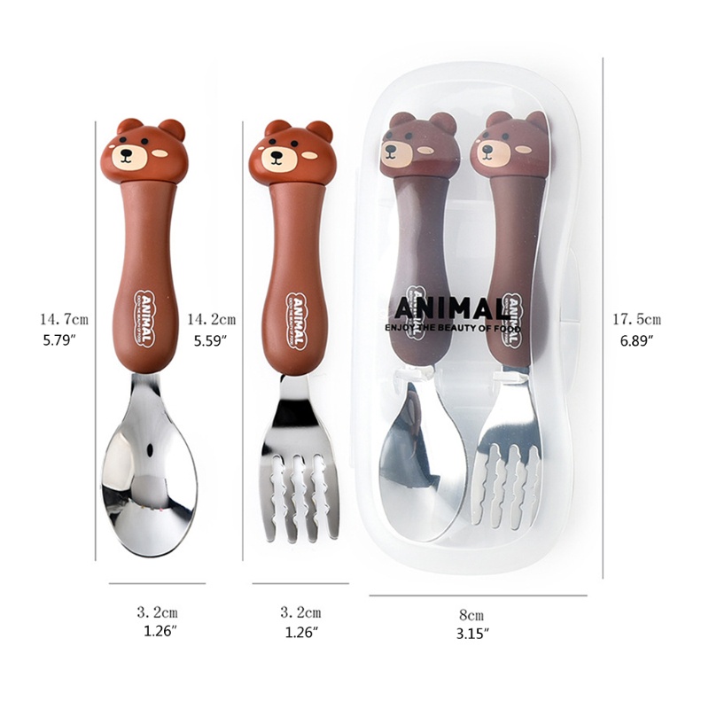 Specification: Material: PP+304 Stainless Steel Spoon Size: app.3.2x14cm/1.26x14cm Fork Size: app.3.2x13.8cm/1.26x5.43in Storage Box Size: app.8x17.5cm/3.15x6.89in Optional Color: Green Frog, Brown Bear, Gray Cat, Pink Rabbit, Black Dog, Yellow Squirrel, Yellow Screaming Chicken, Blue Purple Calf Quantity: 1 Set