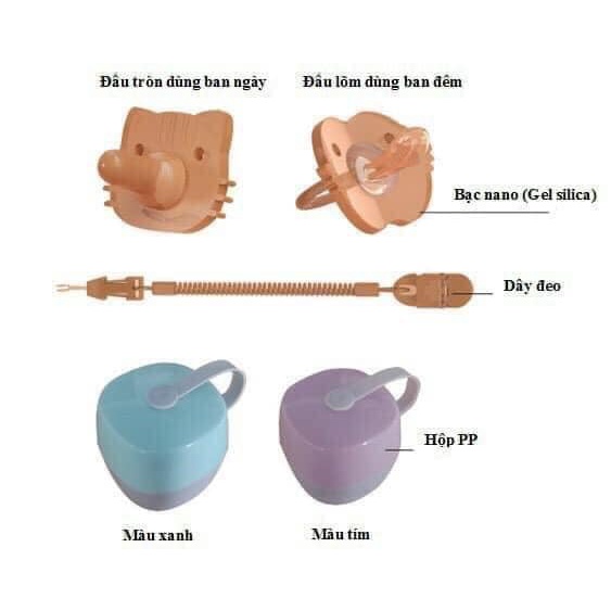 BABIBU-Chuyên sản phẩm CHẤT LƯỢNG, TIỆN ÍCH và AN TOÀN cho cả mẹ và bé. HỘP 2 TI GIẢ NANO BẠC EMMA CHỐNG VẨU CHO BÉ (TẶNG KÈM DÂY ĐEO) Set gồm : 1 ti giả đầu tròn dùng ban ngày 1 ti giả đầu lõm dùng ban đêm 1 hộp đựng Tặng kèm 1 dây đeo ✔️ Thông tin chung: - Núm ti silicon độ mềm phù hợp cho bé từ sơ sinh 0m+. - Sản phẩm được tráng bạc nano, tăng tối đa khả năng kháng khuẩn, hạn chế vi khuẩn phát triển trên bề mặt núm ti giả. - Ti giả được đúc liền khối, hoàn toàn ko lo đọng nước bên trong khi luộc tiệt trùng như các loại ti giả thông thường khác. - Dây đeo giúp tránh bị rơi khi bé ngậm. - Hộp đựng giúp giữ vệ sinh và mang theo 1 cách dễ dàng khi cho bé đi ra ngoài.