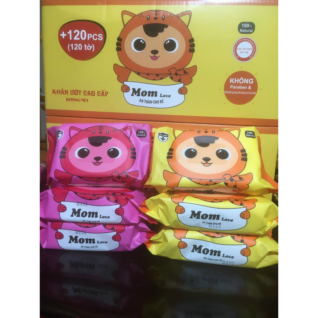 Thùng 24 gói Khăn ướt Mom Love 120 tờ - Không mùi Mềm Mịn Tiện Lợi an toàn cho bé - Thành phần: Vải không dệt mềm mại với tinh chế Aloe Vera giúp bảo vệ và giữ ẩm cho da, không chứa cồn, và xà phòng tiện dụng cho cả gia đình mọi lúc mọi nơi - Xuất xứ: Việt Nam - Sản phẩm khăn giấy ướt được sản xuất từ nguyên vật liệu chọn lọc đặc biệt, phù hợp cho làn da nhờn và nhạy cảm. - Với hương liệu được chiết xuất từ 100% các chất tự nhiên như trà xanh, Aloe Vera giúp sản phẩm có tính giữ ẩm ưu việt, giúp làn da em bé luôn tươi mát và mềm mại. - Sản phẩm không chứa cồn, chất sút và không gây kích ứng da. - An toàn sử dụng cho em bé và cả gia đình.