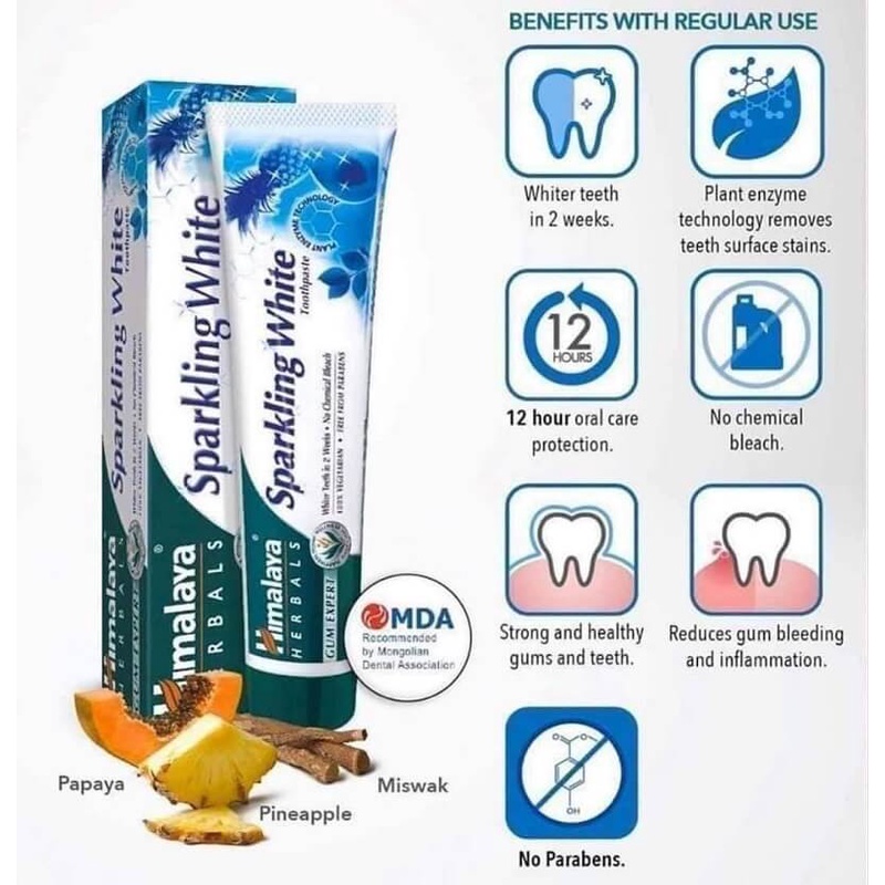 👑 Nướu răng khỏe mạnh là chìa khóa cho răng khỏe mạnh và vệ sinh răng miệng tốt. Kem đánh răng Thảo Mộc Himalaya chứa Miswak, một chất làm se tự nhiên giúp duy trì sự chắc khỏe và bảo vệ cho nướu răng. Kem đánh răng trắng sáng lấp lánh Himalaya Sparkling White Toothpaste dựa trên công nghệ Enzym thực vật từ đu đủ và dứa, nhẹ nhàng loại bỏ vết bẩn trên bề mặt răng trong 2 tuần, giúp răng trắng sáng bật tông. Miswak giúp ngăn ngừa và giảm chảy máu nướu răng. Papain và Bromelain là enzyme có trong đu đủ và dứa, giúp làm trắng răng. Đồng thời bột vỏ hạnh nhân sẽ giúp se nướu tự nhiên có hiệu quả nhanh. Bạc hà tái tạo tự nhiên và ngăn sự xâm hại từ vi khuẩn. Hiệu quả trắng sáng chỉ sau 2 tuần sử dụng