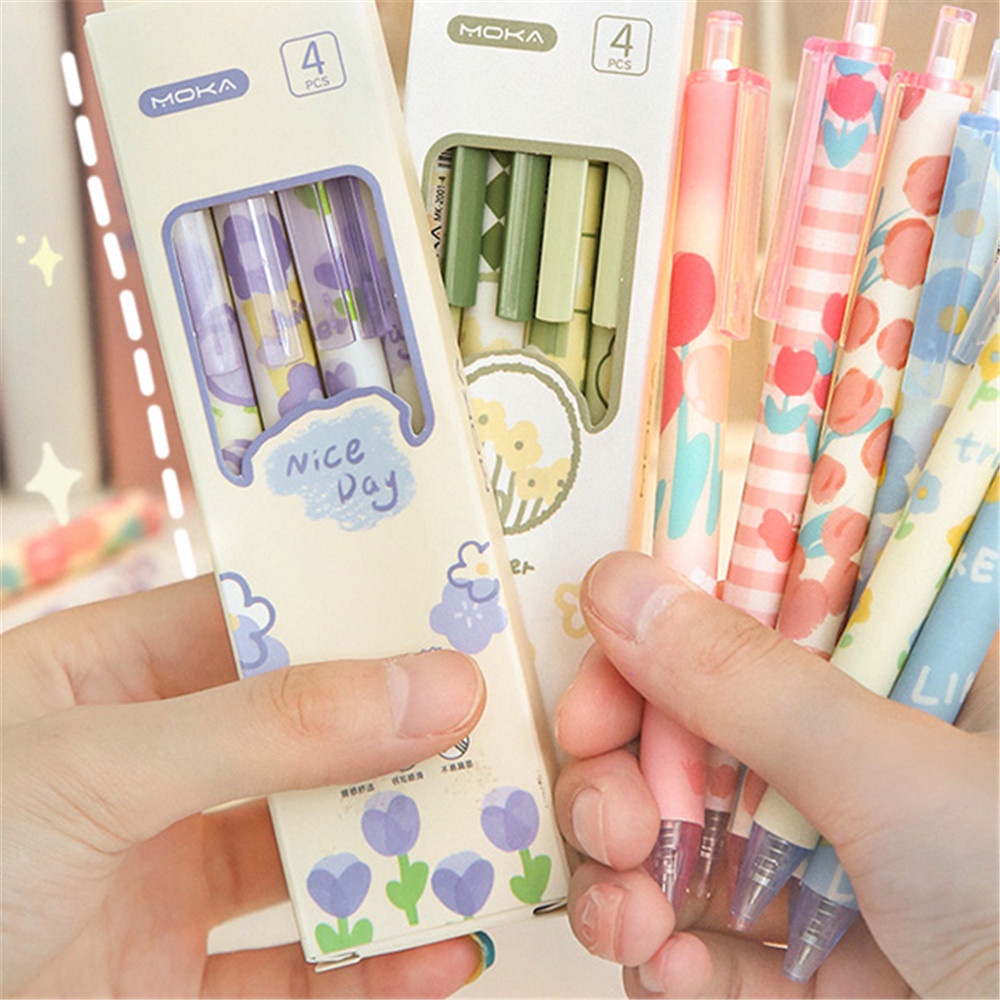 Giới thiệu Set 4 Bút Mực Đen Ngòi 0.5mm Hình Hoa Tulip Dễ Thương Có Thể Thu Gọn Cho Học Sinh / Văn Phòng
