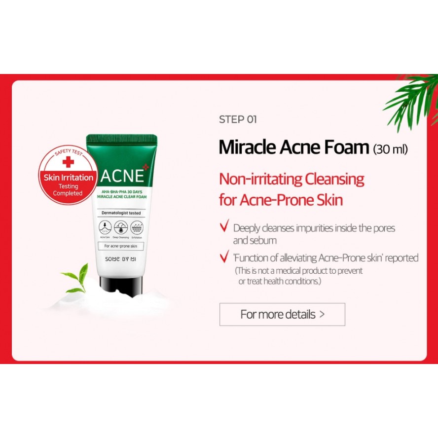 THÔNG TIN CHI TIẾT: * Đặc trưng: - Bộ dưỡng gồm 4 sản phẩm giúp cân bằng da, làm sạch, loại bỏ bã nhờn, hỗ trợ giảm mụn, phục hồi da nhanh chóng. Với 3 thành phần chính AHA/BHA/PHA giúp loại bỏ tế bào chết một cách nhẹ nhàng và nhanh chóng làm khô còi mụn, giảm mụn giúp da mịn màng trong 30 ngày + Miracle Acne Clear Foam 30ml : Sữa rửa mặt có khả năng làm sạch mọi bụi bẩn, lớp make up tàn dư và dầu nhờn làm dịu da và bổ sung độ ẩm cho da. Chứa thành phần Truecica độc quyền của Some By Mi chứa nhiều thành phần thiên nhiên như ngải cứu, tràm trà và rau má với kết cấu tạo bọt với những bọt xốp li ti và mềm mại + Miracle Toner 30ml: Nước hoa hồng hỗ trợ giảm mụn, loại bỏ tế bào chết, mụn đầu đen, cung cấp độ ẩm làm dịu da với thành phần AHA - BHA - PHA, độ pH 5.5 giúp cân bằng cải thiện làn da khỏe mạnh với kết cấu lỏng nhẹ cùng cảm giác the mát hương bạc hà dễ chịu + Miracle Serum 10ml: Tinh chất hỗ trợ giảm mụn, giảm sưng tấy; nuôi dưỡng làn da khỏe mạnh với thành phần AHA-BHA-PHA, làm dịu da, bảo vệ da, tái tạo da nhanh chóng, cung cấp độ ẩm và khóa ẩm 2 lớp với 41 thành phần có nguồn gốc từ thiên nhiên, với kết cấu 2 lớp dầu + nước mang lại cảm giác nhẹ nhàng và ẩm mịn cho da + Miracle Cream 20g: Kem dưỡng giúp giảm sưng tấy, hỗ trợ giảm mụn; tăng cường sức mạnh của "hàng rào" bảo vệ da, làm dịu da, loại bỏ tế bào chết, kiểm soát bã nhờn, chống oxy hóa, chống lại tác nhân gây hại từ môi trường bên ngoài, cung cấp độ ẩm, dưỡng sáng da, ngăn ngừa nếp nhăn, kết cấu dạng gel hấp thụ nhanh, không gây bết dính, mang lại cảm giác tươi mát. - Chứa các thành phần thuộc Green Class của EWG; không chứa 20 thành phần gây hại cho da