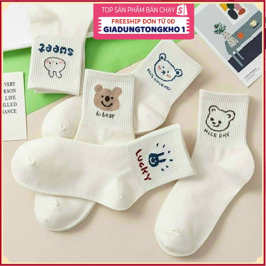Set 5 Đôi Tất Vớ Cổ Cao Gấu Thỏ Trắng🍀GIADUNGTONGKHO1🍀Tất vớ nữ cổ cao trắng họa tiết gấu xinh xắn style Hàn Quốc Cute