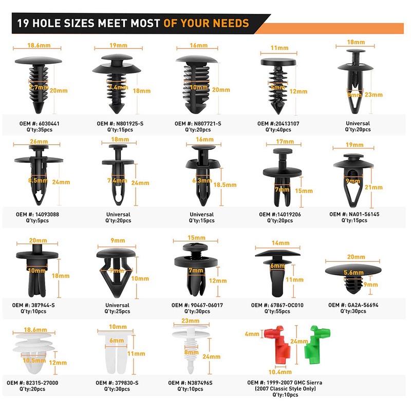 Bộ dây buộc đinh tán cản này được làm bằng nhựa và không bị gỉ hoặc mục nát. Có thể sử dụng lâu dài. Nó là rất thuận tiện để sử dụng. Đây là một kiểu đẩy, và đầu đinh tán ấn vào chân nối dài, thuận tiện và nhanh chóng khi lắp đặt. Chúng được sử dụng để thay thế các kẹp trang trí, kẹp cửa, kẹp cửa, kẹp cản, kẹp chắn bùn, mũ trùm đầu và các bộ phận bảo vệ chống văng.