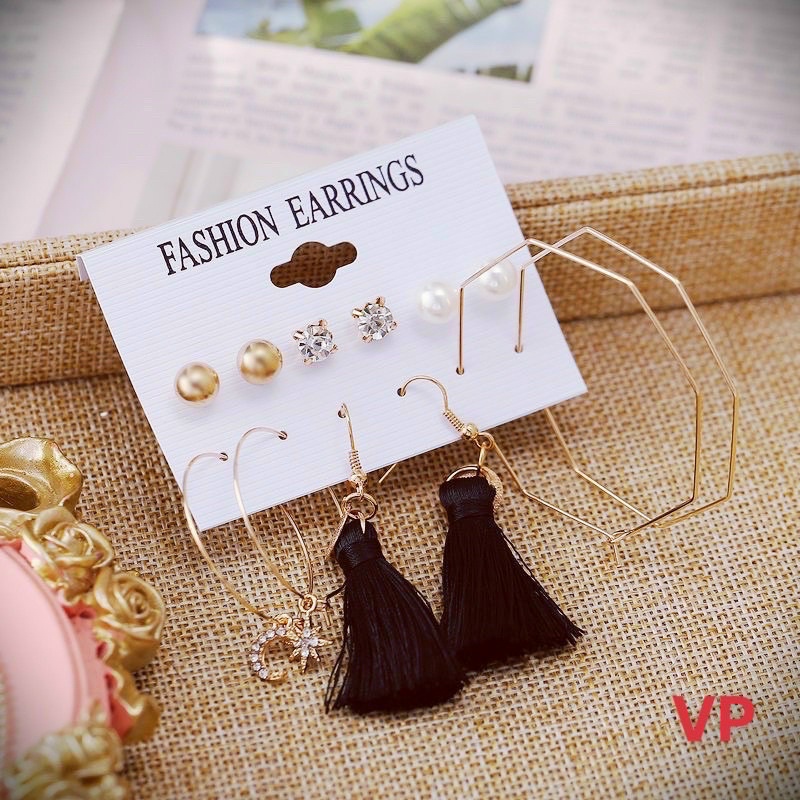 Giới thiệu SÉT 6 ĐÔI KHUYÊN TAI FASHION CÓ TUA ĐEN