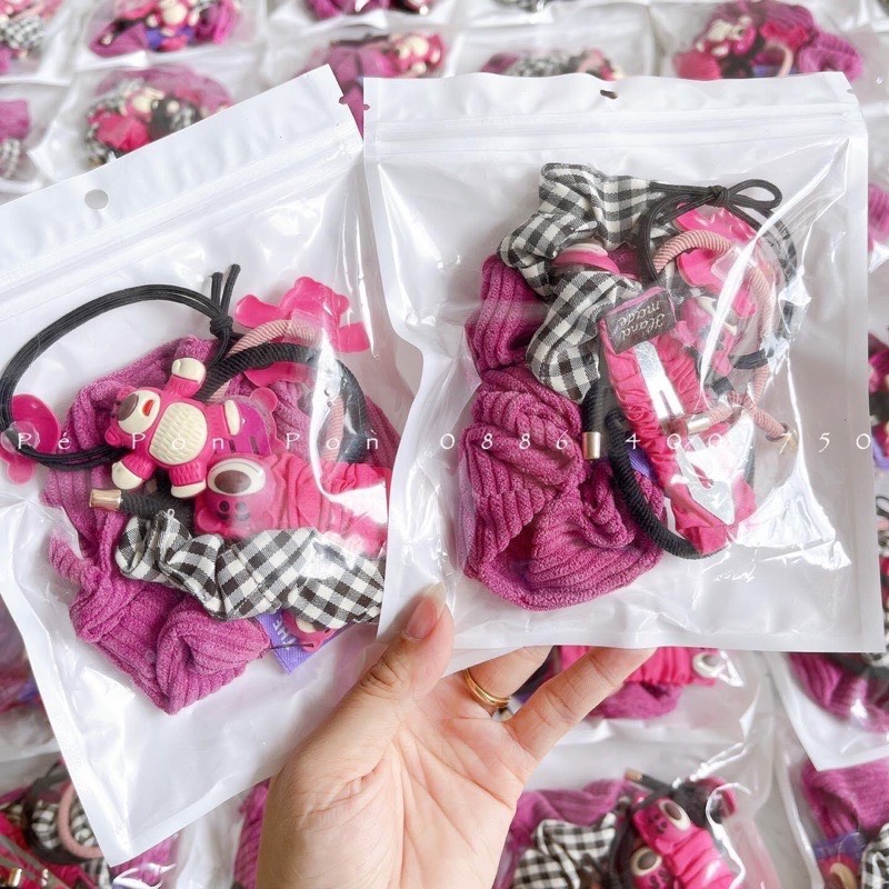 7 chi tiết chun tóc kẹp tóc hoạ tiết gấu hồng lotso siêu hot set gồm 7 món : chun tóc + kẹp tóc gấu