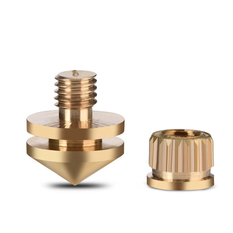 Đặc trưng: Chất liệu đồng nguyên chất cho hiệu quả tốt hơn. Lớp mạ cao cấp, đẹp, sáng, không dễ bị trầy xước. Đệm đế chống sốc của loa được sử dụng giữa mũi nhọn và mặt đất, để giảm thiểu độ rung có hại. Có thể dùng cho loa HiFi và chân đế loa để tránh rung. Đặc biệt phù hợp với loa nặng do thiết kế thân hình bầu bĩnh