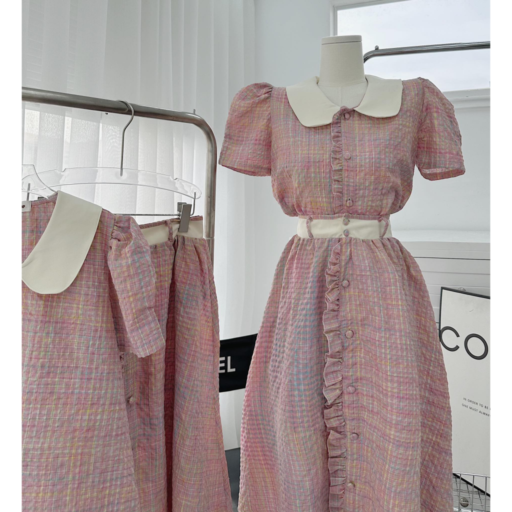 Giới thiệu SET ÁO CARO HỒNG PHỐI CỔ SEN + CHÂN VÁY BÈO NÚT BỌC