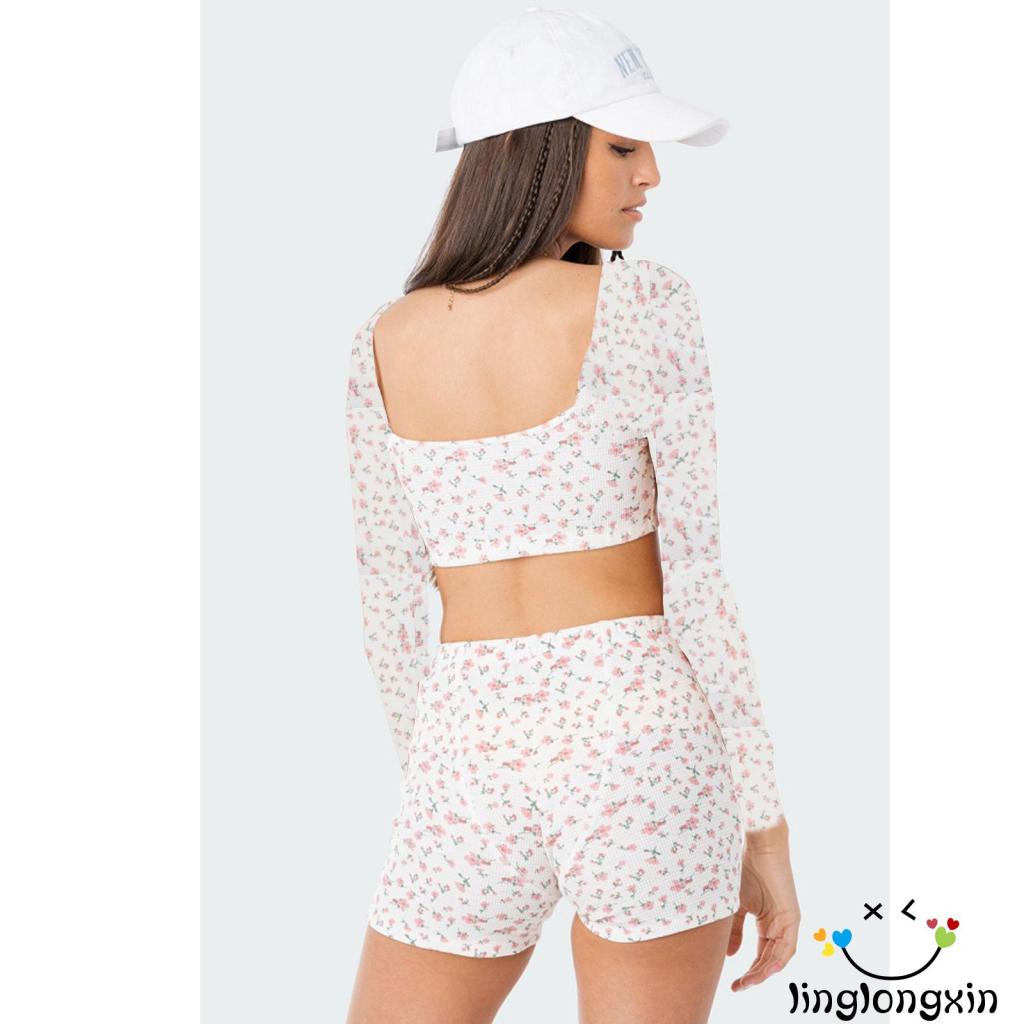 Trang phục hai mảnh mùa hè cho phụ nữ, áo cắt dài tay + quần short hoa eo cao