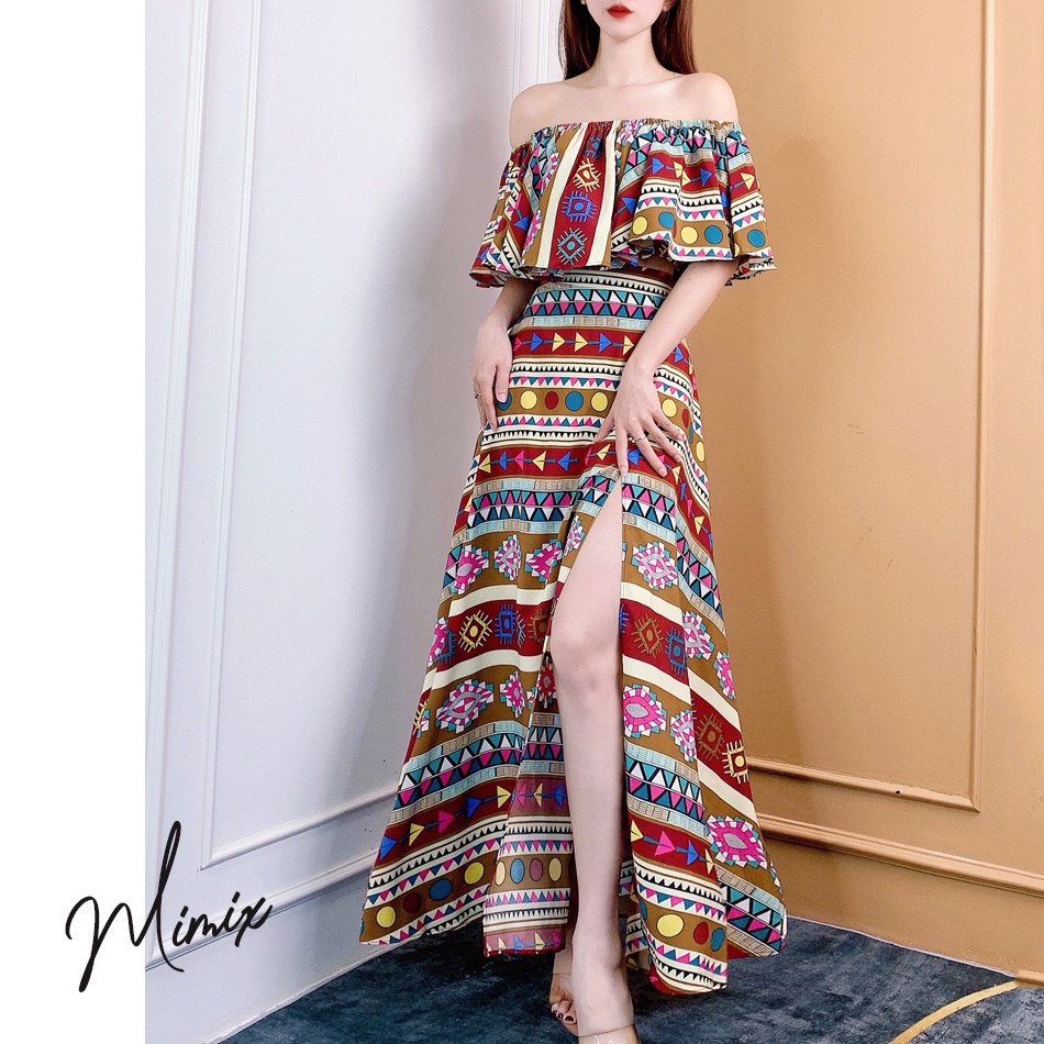 Giới thiệu Set áo croptop bèo kèm chân váy xẻ họa tiết thổ cẩm MIMIX CG0230