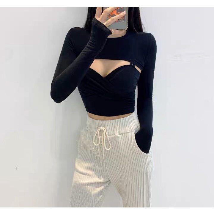 Set áo bao gồm : 1 áo croptop xoắn ngực + 1 áo tay dài form ôm body