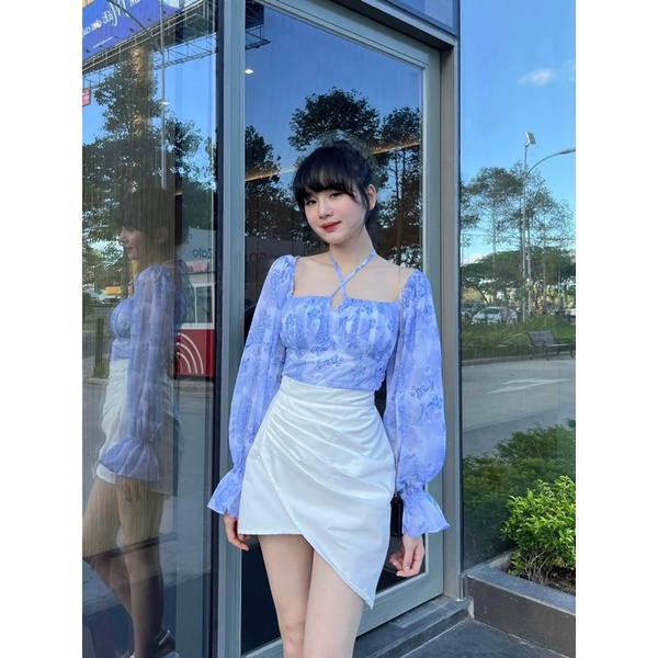 Giới thiệu SET ÁO HOA XANH XẾP NGỰC BẸT VAI CỘT DÂY CỔ + CHÂN VÁY TRẮNG ĐẮP CHÉO