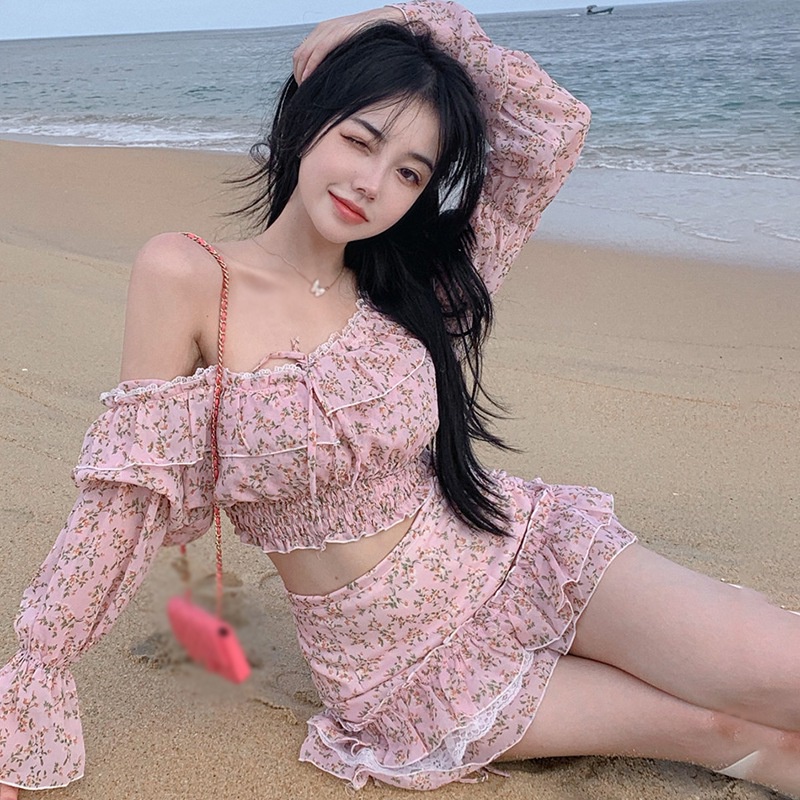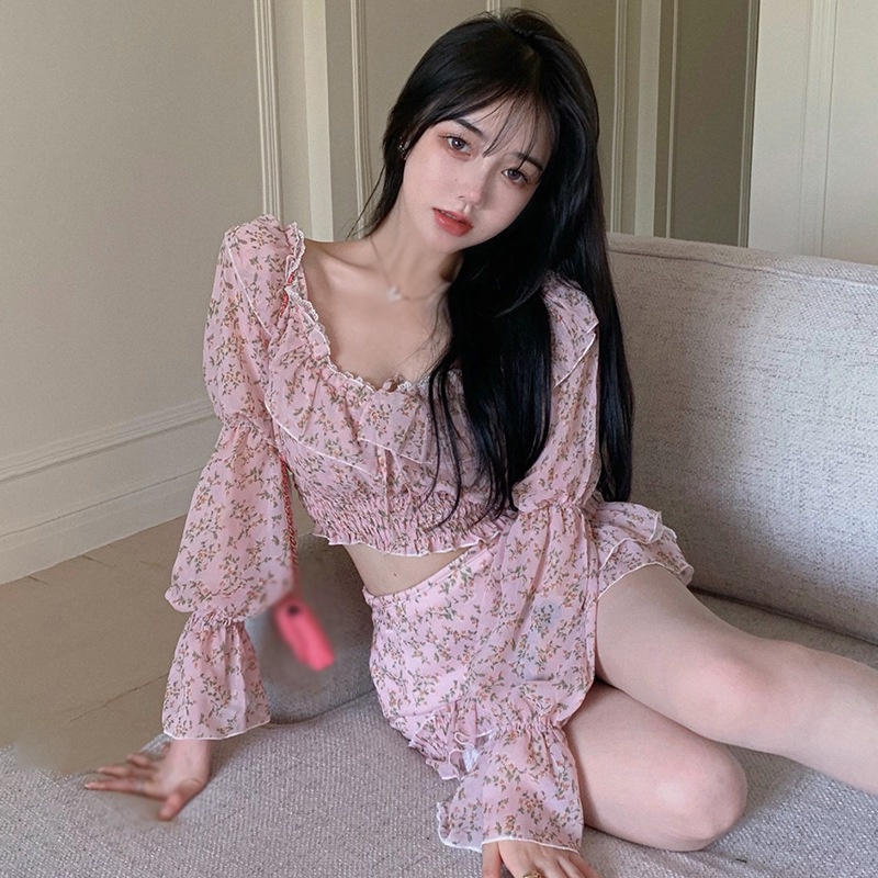 Giới thiệu Set Áo Kiểu Hở Rốn Phối Ren Hoa + Chân Váy Lưng Cao In Họa Tiết Hoa Thời Trang Cho Nữ