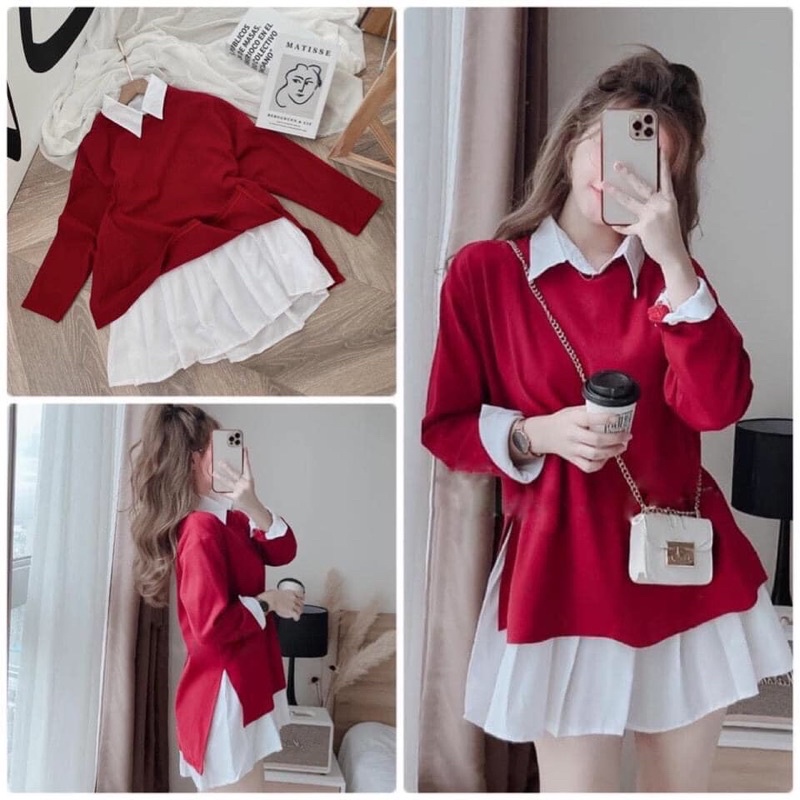 Giới thiệu Set áo sơ mi dáng dài dập li kèm áo đỏ xẻ tà siêu xinh