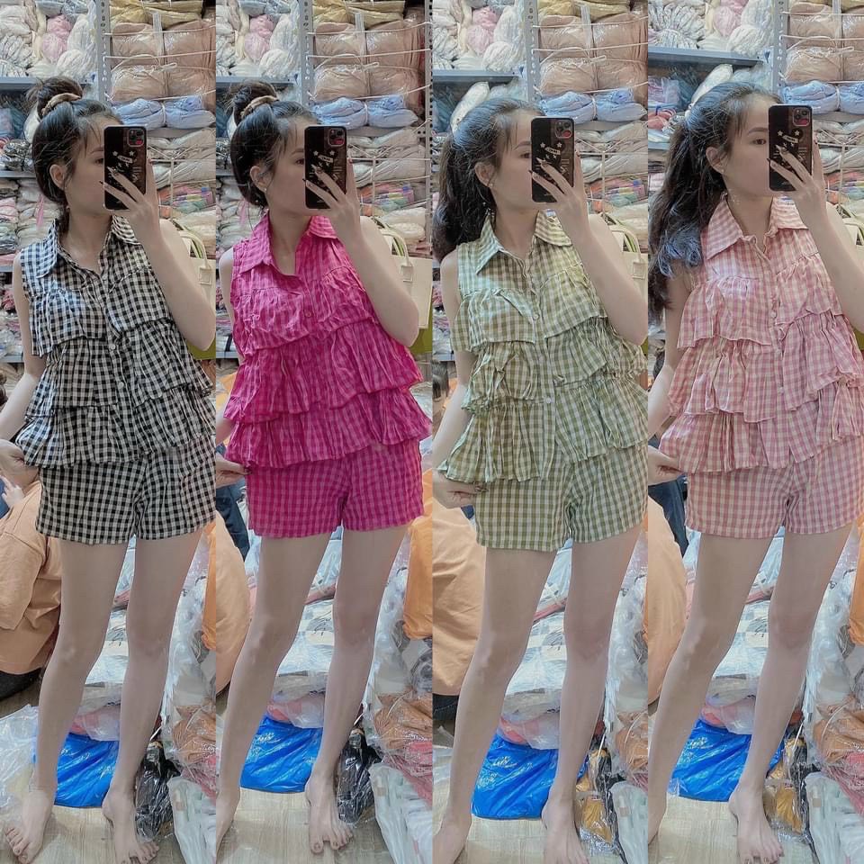 Giới thiệu Set áo sơ mi tầng sát nách, quần short có túi cho nữ mặc nhà, mặc đi chơi, vải siêu đẹp