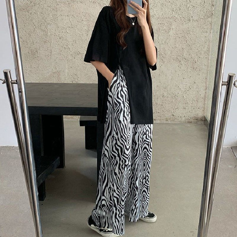 Thời Trang Nữ > Áo > Áo thun > Set Áo Thun Ngắn Tay Xẻ Tà + quần ống rộng Họa Tiết Ngựa Vằn Phong Cách Hàn Quốc Mới Cho Nữ