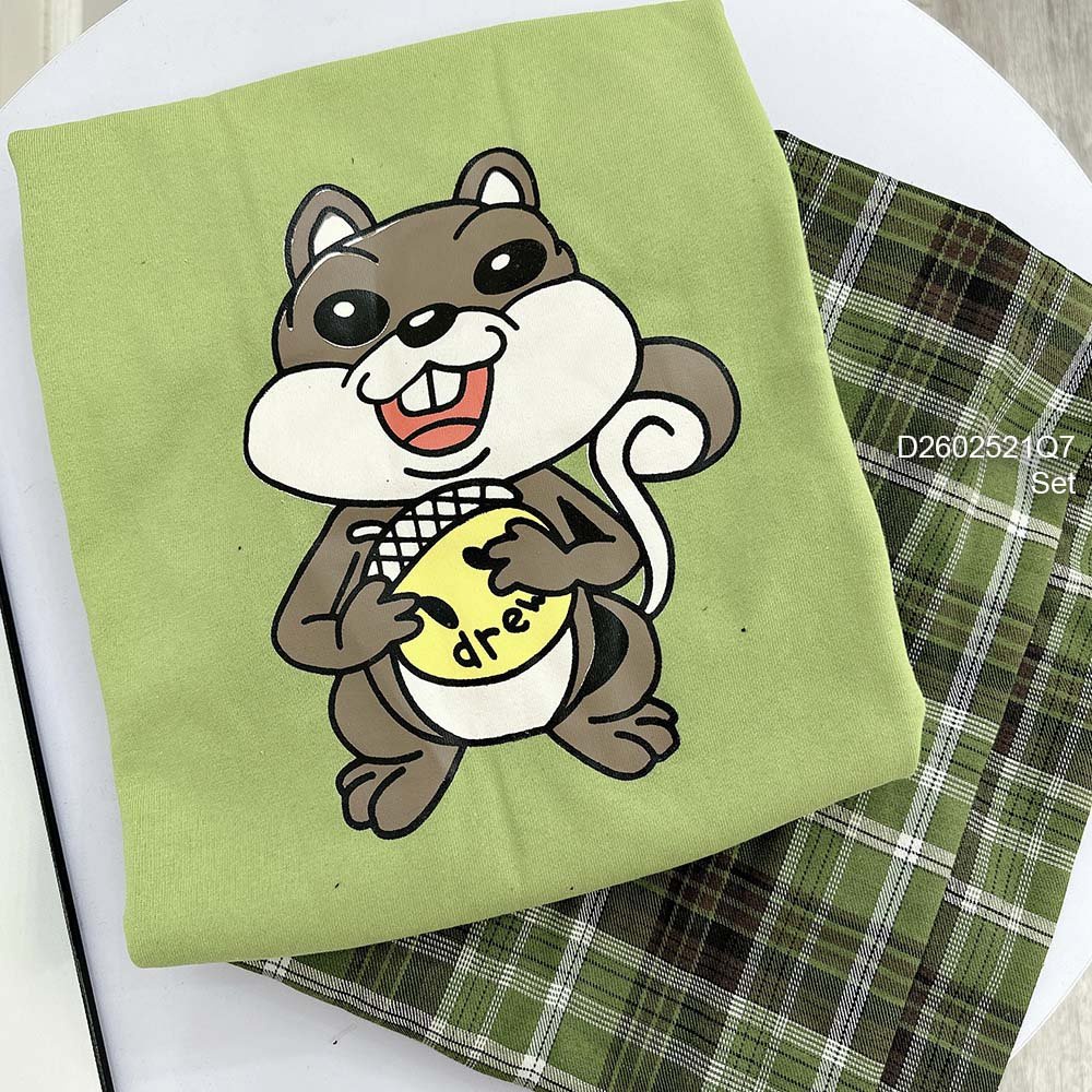 Giới thiệu Set bộ 2 món áo thun xanh hình họa tiết sóc tay con phối quần suông dài kẻ caro!