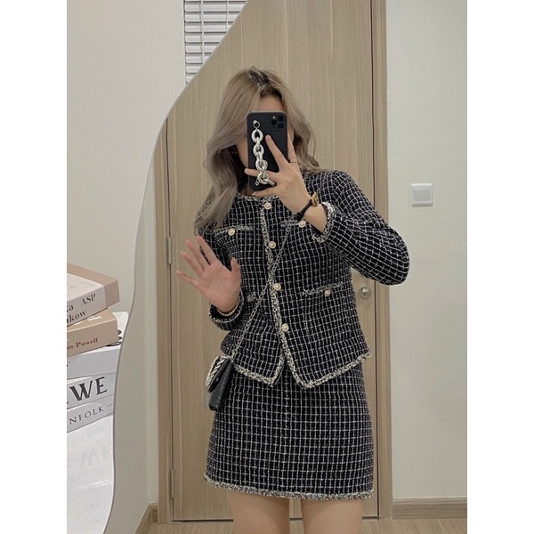 Giới thiệu SET BỐ CARO ĐEN TAY DÀI + CHÂN VÁY
