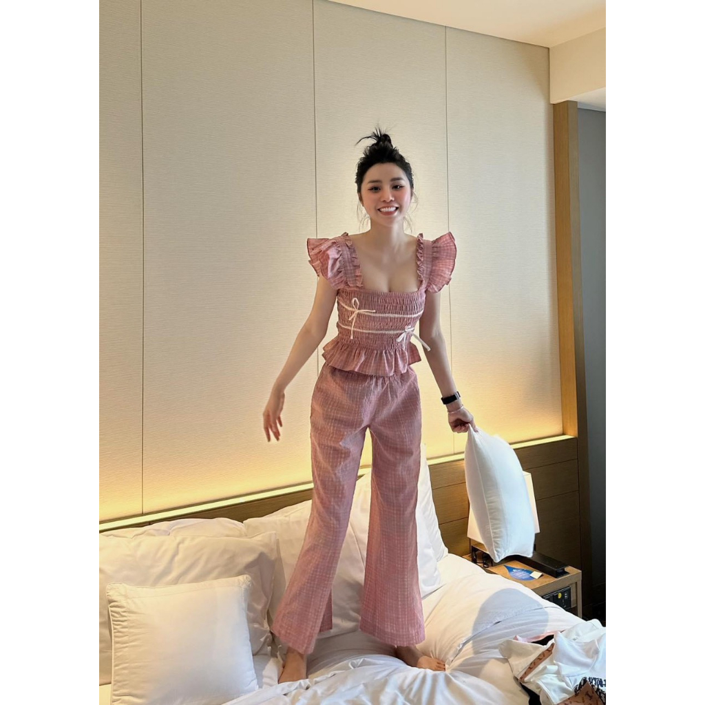 Giới thiệu Set Bộ Đồ Nữ Áo Caro Nữ Tay Cánh Tiên Chạy Chun Trần Hai Dây Buộc Xoè Gấu Mix Quần Kẻ Caro Dáng Dài Freesize