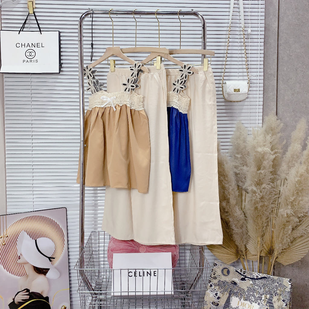 Giới thiệu Set Bộ Đồ Nữ Áo Hai Ren Dệt Thổ Cẩm Phối Xanh Mix Quần Suông Trơn Màu Kem Freesize