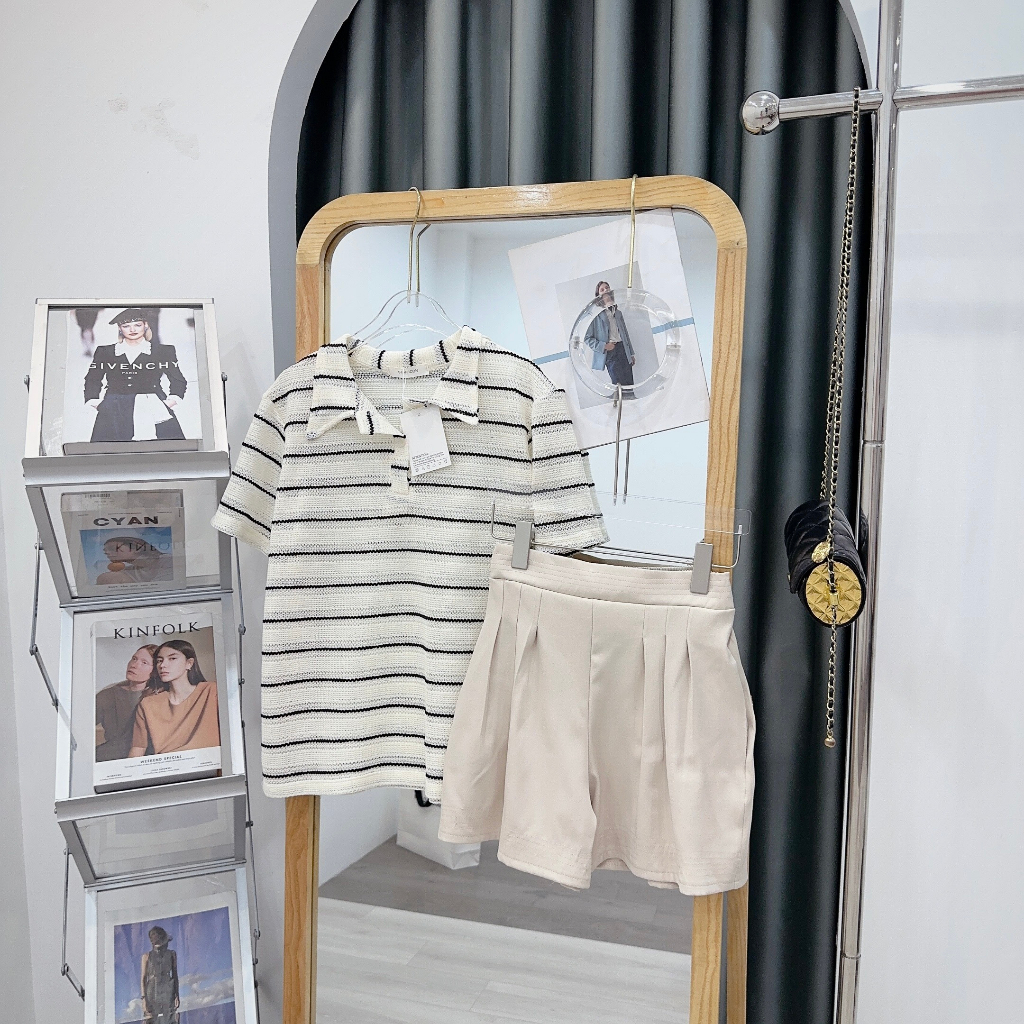 Giới thiệu Set Bộ Đồ Nữ Áo Len Motoghi Kẻ Ngang Cổ Bẻ Mix Quần Sooc Đùi Ống Rộng Freesize