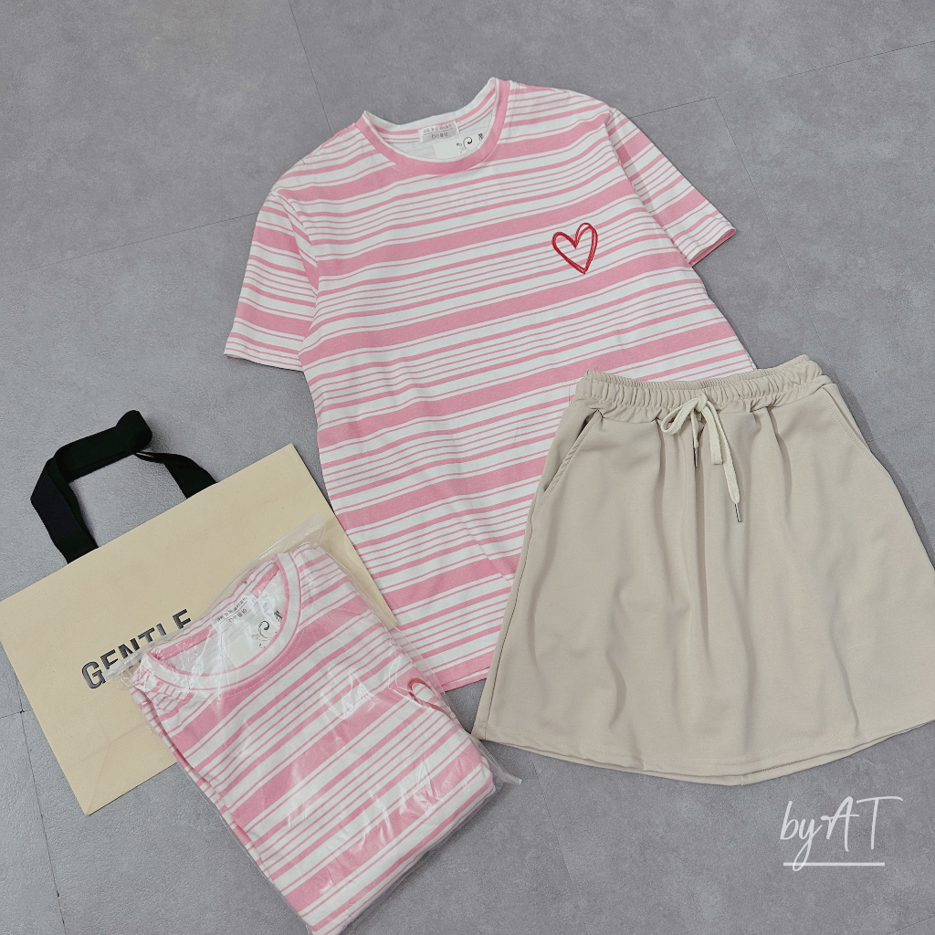 Set Bộ Đồ Nữ Áo Phông Kẻ Hồng Trái Tim Mix Chân Váy Chữ A Màu Be Có Lót Trong Freesize
