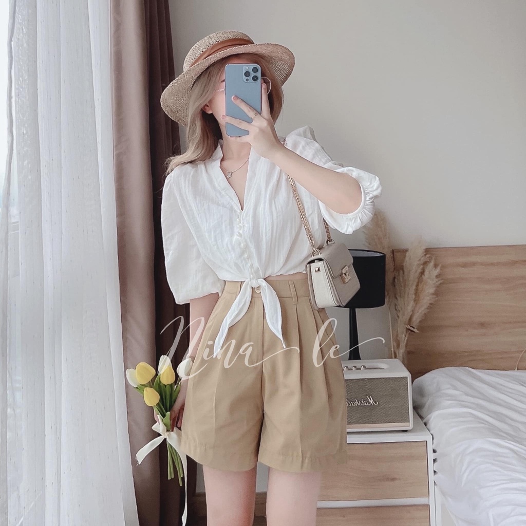 Giới thiệu Sét bộ đồ nữ áo sơ mi tay lửng kết cườm phới quần đùi ống rộng xinh xắn giúp nàng nổi bật đi chơi, đi biển