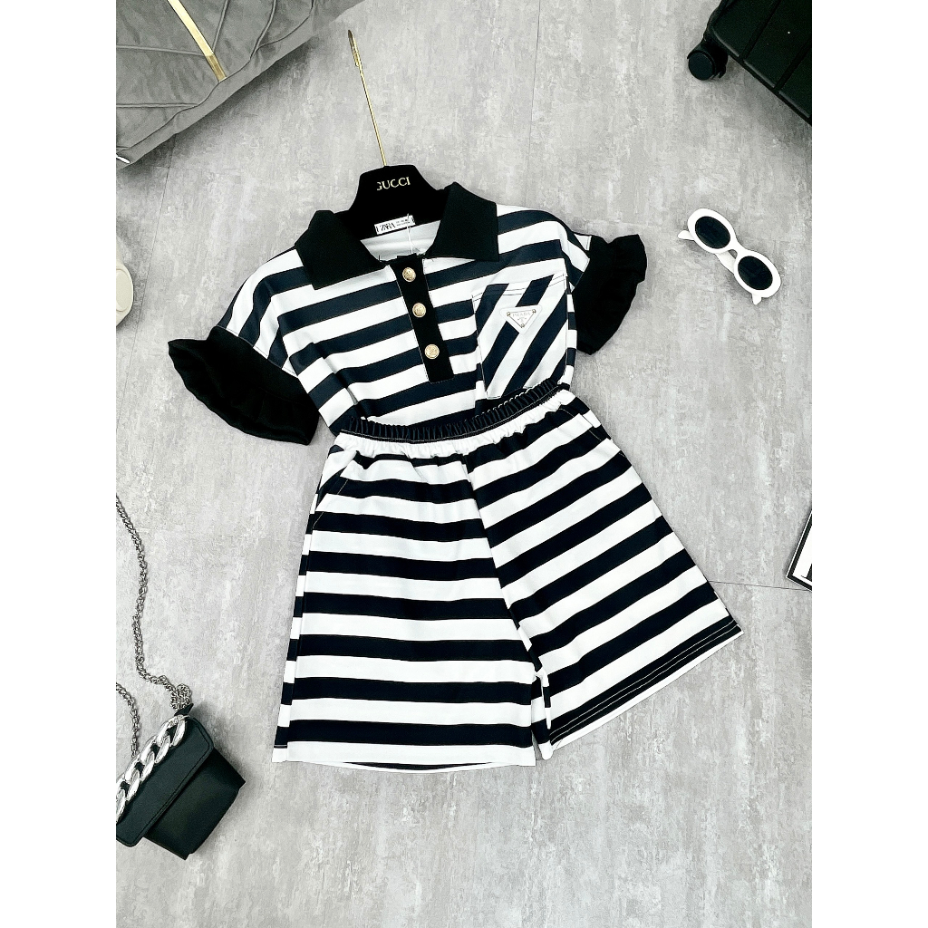 Giới thiệu Set Bộ Đồ Nữ Kẻ Ngang Đen Trắng Áo Prada Cúc Cổ Phối Viền Tay Cánh Tiên Mix Quần Sooc Đùi Freesize